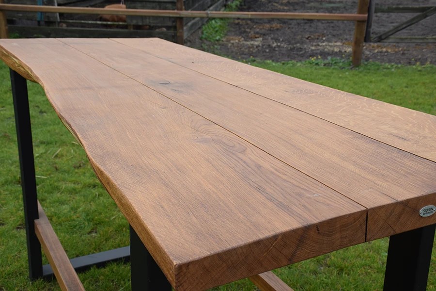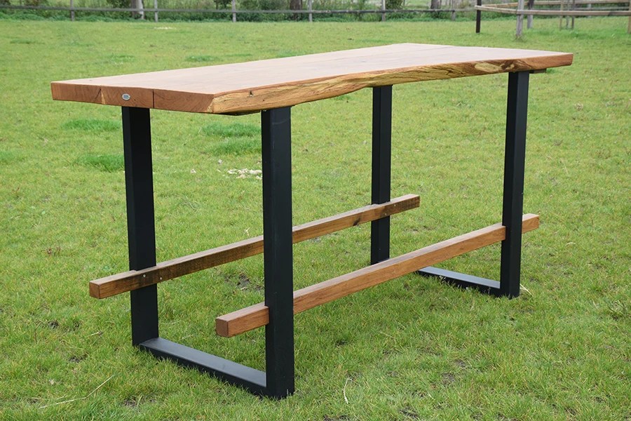 Deze fraaie bartafel of statafel heeft een boomstam eikenhouten tafelblad en staat op twee zwart stalen U-poten (5 x 10 cm). Het onderstel is voorzien van een houten voetensteun. Het tafelblad is behandeld met terrasolie.